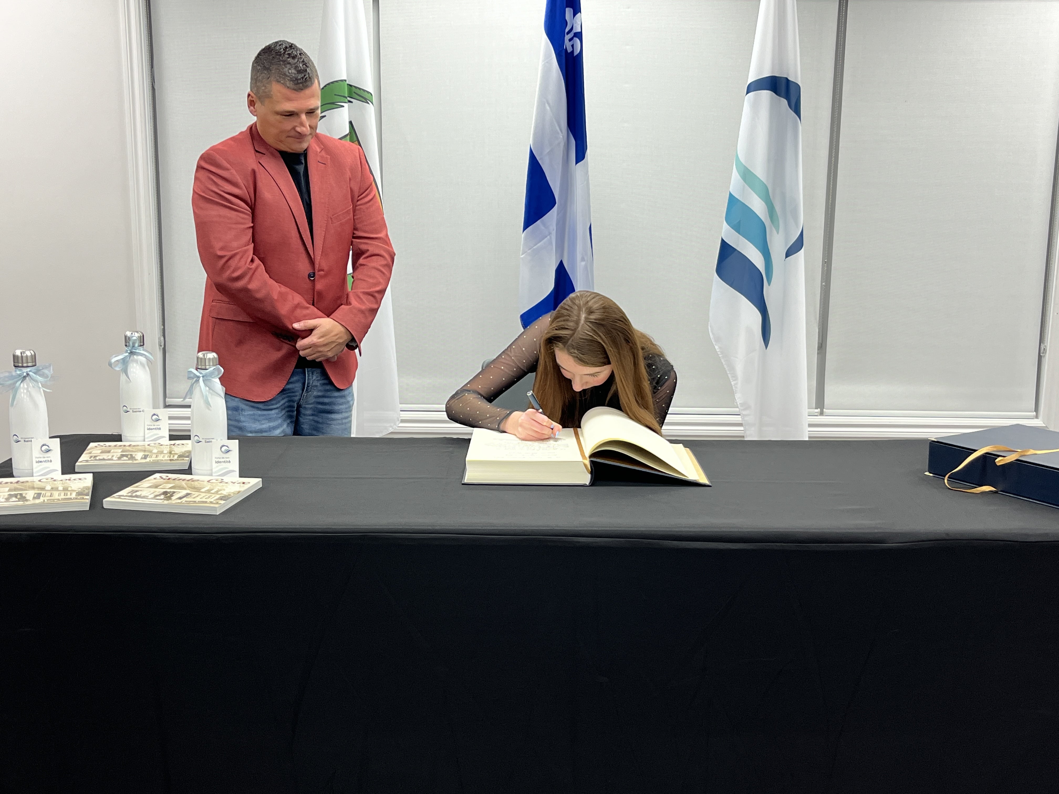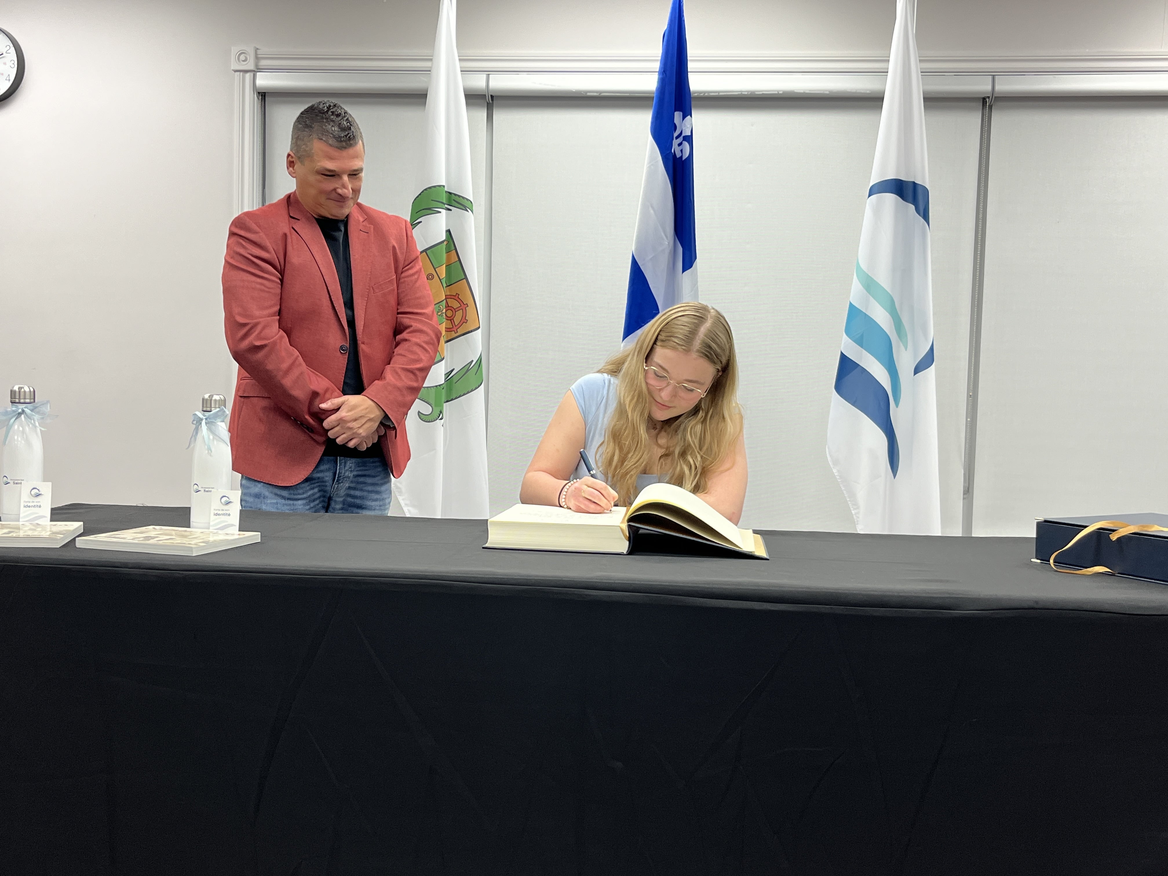 Charles-Éloi Blanchet a également été invité à signer le livre d'or. Il a remporté les finales locale et régionale de Secondaire en spectacle au printemps dernier. Il chantait et s'accompagnait à la guitare en interprétant la pièce Montagne de l'auteur-compositeur JP «Le Pad» Tremblay. Ses victoires à ce concours musical contribuent de manière exceptionnelle à notre communauté et méritent d’être mises en lumière. Notons que Charles-Éloi a aussi été reçu à l’Assemblée nationale du Québec et présenté par la députée de Lotbinière-Frontenac, Mme Isabelle Lecours, lors de cette occasion.