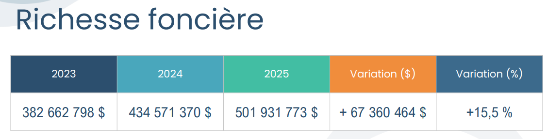 La richesse foncière de Sainte-Croix continue de croître avec une hausse de 15,5 % au cours de la dernière année pour s’élever aujourd’hui à 501 931 773 $, soit la troisième en importance de la MRC de Lotbinière. Il s’agit d’une excellente nouvelle avec une forte hausse de 31 % au cours des trois dernières années.