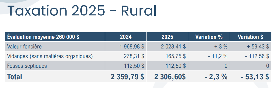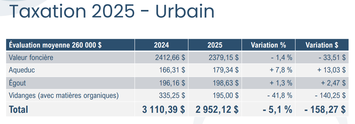 Ce budget prévoit des baisses de taxes moyennes de 5,1 % pour le secteur urbain et 2,3 % pour le secteur rural. Concrètement, cela signifie une diminution de 158,27 $ en milieu urbain et 53,13 $ en milieu rural pour une résidence évaluée à 260 000 $.