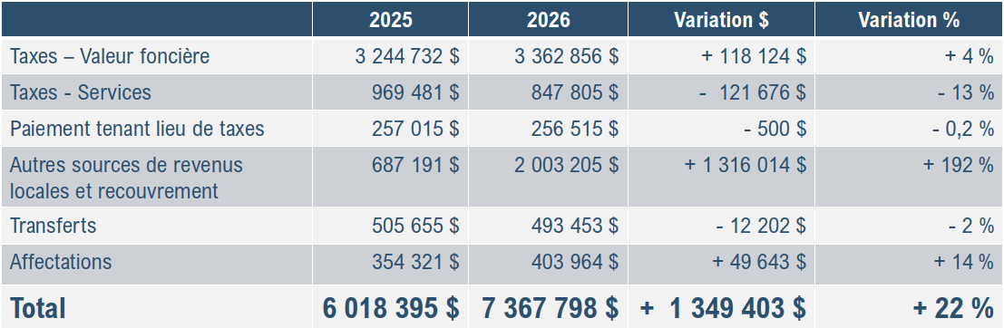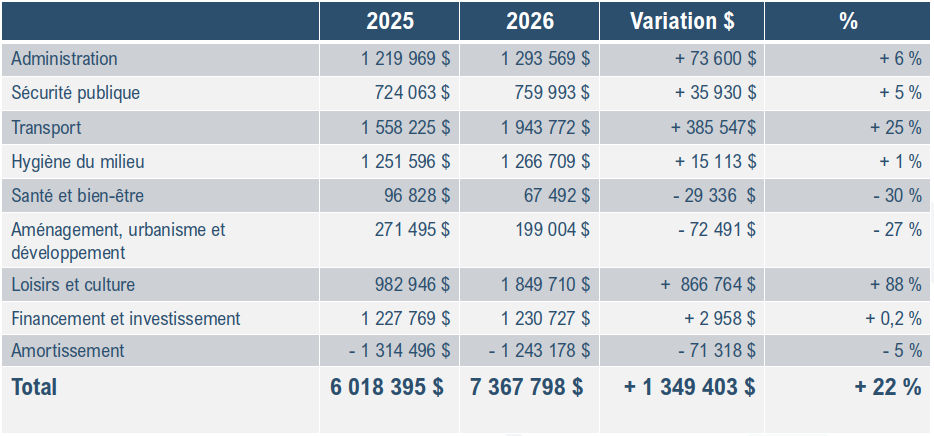 Les membres du conseil municipal ont adopté à l’unanimité les prévisions budgétaires 2026 lors de la séance extraordinaire du 22 décembre dernier. Il s’agit d’un budget équilibré comprenant des revenus et des dépenses totalisant 7 367 798 $.