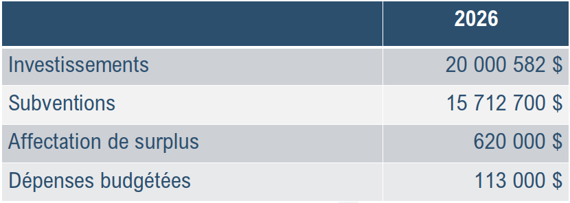 La Municipalité de Sainte-Croix prévoit dans son Programme triennal d’immobilisations 2026-2027-2028 des investissements de 20 millions de dollars pour l’année 2026, dont plus de 79 % provenant de subventions gouvernementales.