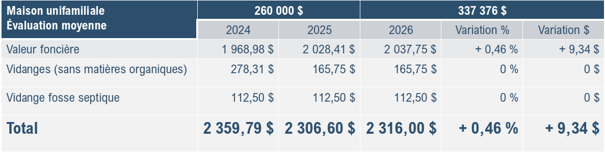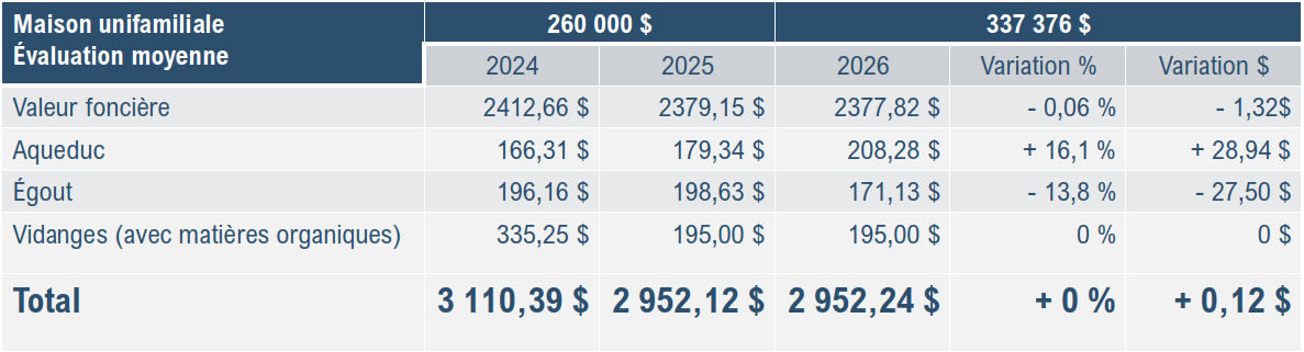Nous avons pris la décision de diminuer les taux de taxation foncière pour atténuer au maximum les impacts du nouveau rôle triennal d’évaluation déposé à l’automne 2025. Celui-ci comprend une hausse moyenne de la valeur de l’ensemble des immeubles de 24,65 %, dont 29,76 % pour les maisons unifamiliales.