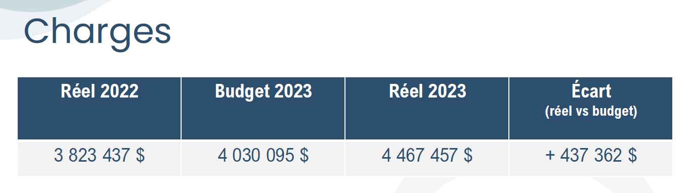 Comme pour l’ensemble des municipalités au Québec, frappées par la forte inflation, les charges ont augmenté pour se situer à 4 467 457 $, soit une différence de 437 362 $ avec les prévisions budgétaires pour l’année 2023. Cet écart s’explique principalement par la hausse des coûts liés à la collecte des déchets, l’inflation, la hausse des taux d’intérêt, l’ajout en cours d’années d’une nouvelle ressource au service des loisirs ainsi que de nouveaux services appréciés, comme la salle de quilles et le centre de conditionnement physique. Voir le tableau des charges en page 7 de la Présentation des états financiers 2023.