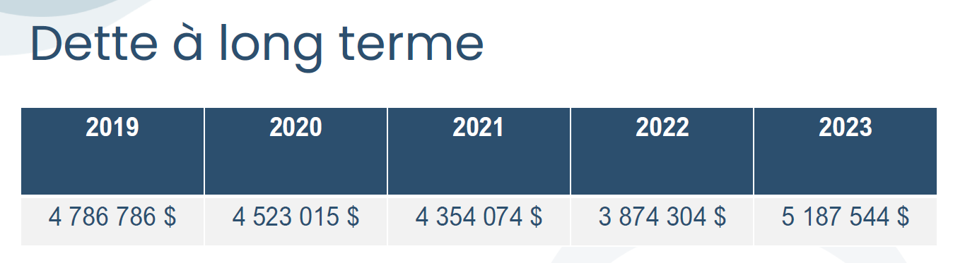 La dette à long terme est un indicateur qui fluctue notamment en fonction de l’échéancier de projets réalisés il y a plusieurs années. Il importe de prendre du recul et de l’analyser sur une longue période. En 2023, la dette à long terme se situe à 5 187 544 $ alors qu’elle s’élevait à 4 786 786 $ en 2019, ce qui correspond avec l’inflation à 5 490 309 $ en dollars coûtant de 2023. Bref, la valeur réelle de la dette à long terme est donc moins élevée aujourd’hui qu’il y a 5 ans. Voir le tableau de la dette à long terme en page 9 de la Présentation des états financiers 2023.