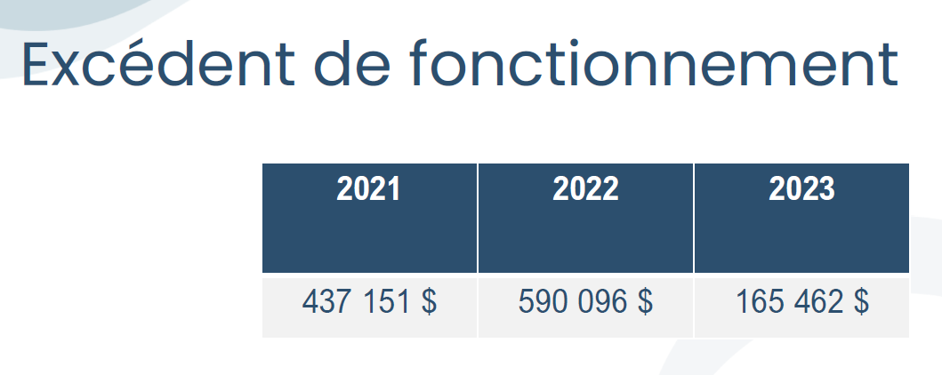En résumé, la Municipalité de Sainte-Croix termine l’année 2023 sur une note positive avec un surplus de fonctionnement de 165 462 $. Voir le tableau de l'exédent de fonctionnement en page 8 de la Présentation des états financiers 2023.