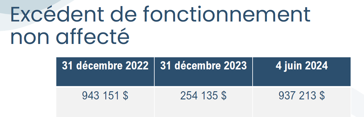 Au 31 décembre 2023, le surplus libre de la Municipalité de Sainte-Croix était de 254 135 $. Toutefois, en date du 4 juin 2024, il se situe à 937 213 $ en raison des ventes de terrain réalisées depuis le début de l’année. Voir le tableau de l'exédent de fonctionnement non affecté en page 10 de la Présentation des états financiers 2023.