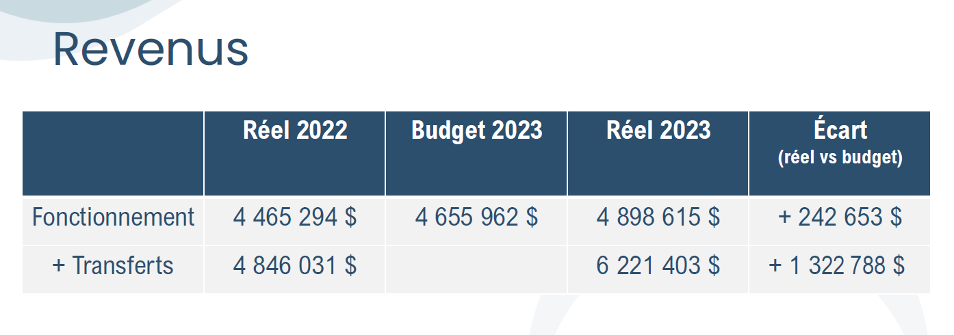 Les revenus de fonctionnement en 2023 s’élèvent à 4 898 615 $, soit 242 653 $ de plus que prévu dans le budget. Il est important de souligner l’augmentation importante des revenus de transfert, soit principalement les subventions reçues. En effet, la Municipalité a enregistré en 2023 des revenus de transferts de l’ordre de 1 322 788 $, une hausse de près d’un million de dollars, ce qui est une excellente nouvelle. Voir le tableau des revenus en page 6 de la Présentation des états financiers 2023.