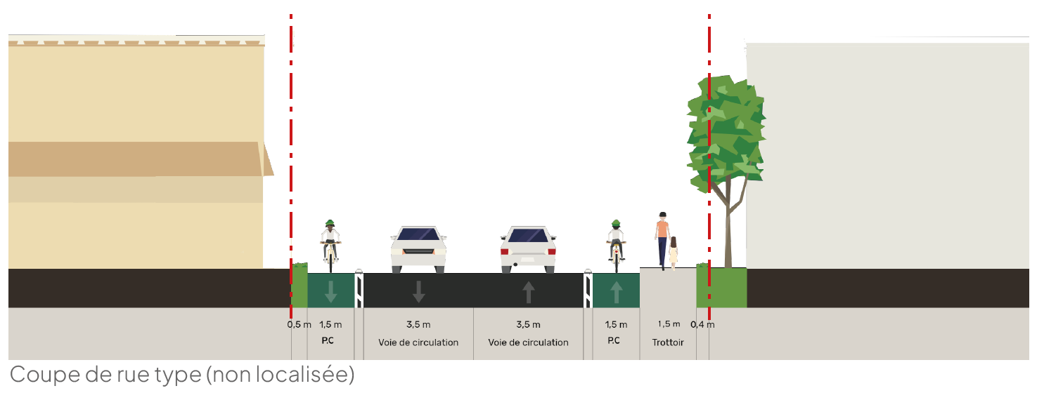 - Ajouter une voie cyclable de 1,5 mètre de chaque côté dans le sens de la circulation ;