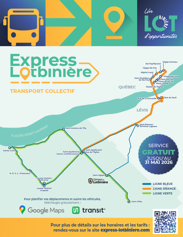 Les lignes bleue et verte de ce transport collectif transitent par Sainte-Croix, Saint-Antoine-de-Tilly, Saint-Apollinaire, Laurier-Station et maintenant Saint-Étienne, Saint-Gilles, Issoudun et Saint-Agapit, où l'arrêt est située au Campus de Lotbinière du Cégep de Thetford.